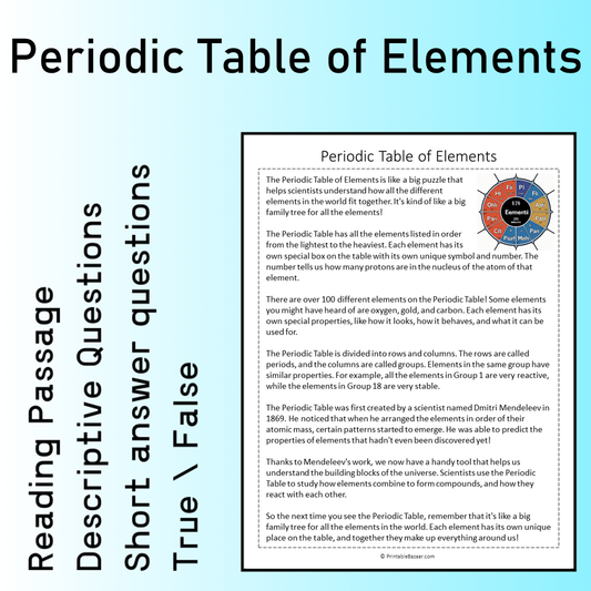 Periodic Table of Elements | Reading Comprehension Passage Printable Worksheet