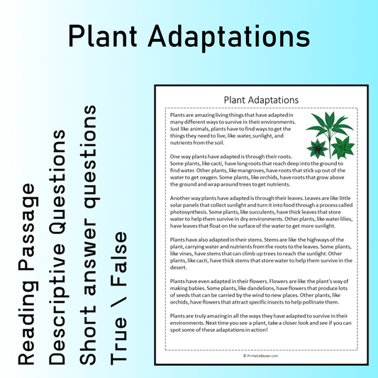 Plant Adaptations | Reading Comprehension Passage Printable Worksheet