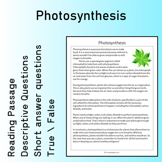 Photosynthesis | Reading Comprehension Passage Printable Worksheet