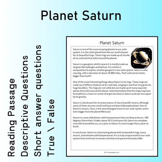 Planet Saturn | Reading Comprehension Passage Printable Worksheet
