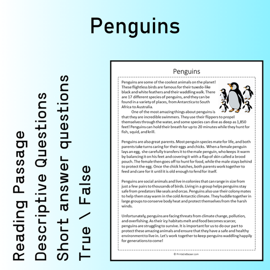 Penguins | Reading Comprehension Passage Printable Worksheet