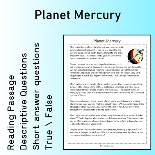 Planet Mercury | Reading Comprehension Passage Printable Worksheet