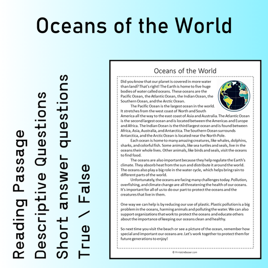 Oceans of the World | Reading Comprehension Passage Printable Worksheet