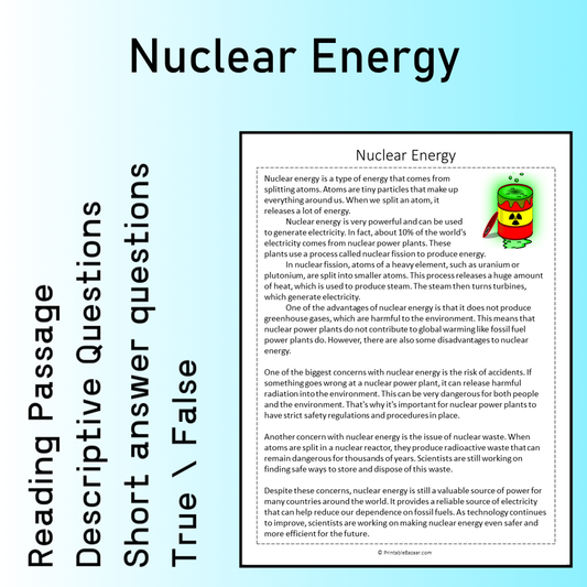 Nuclear Energy | Reading Comprehension Passage Printable Worksheet