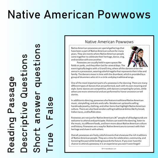 Native American Powwows | Reading Comprehension Passage Printable Worksheet