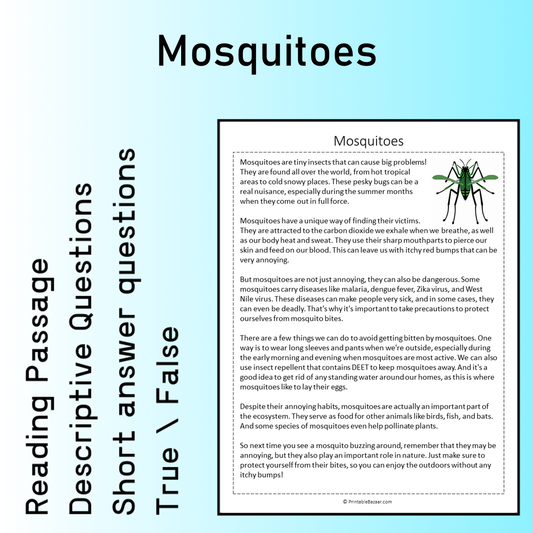 Mosquitoes | Reading Comprehension Passage Printable Worksheet