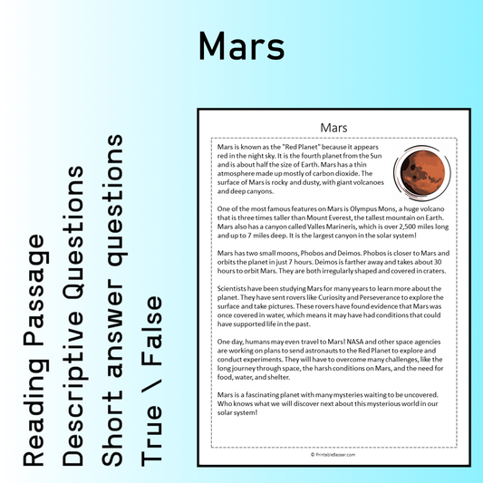 Mars | Reading Comprehension Passage Printable Worksheet