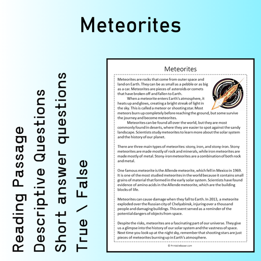 Meteorites | Reading Comprehension Passage Printable Worksheet