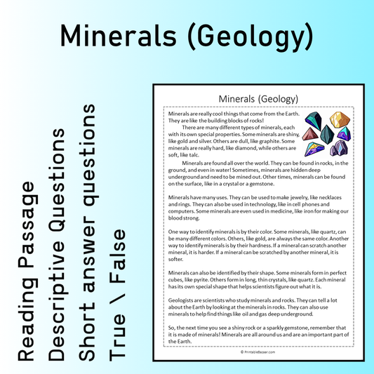 Minerals (Geology) | Reading Comprehension Passage Printable Worksheet
