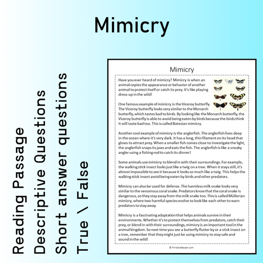 Mimicry | Reading Comprehension Passage Printable Worksheet