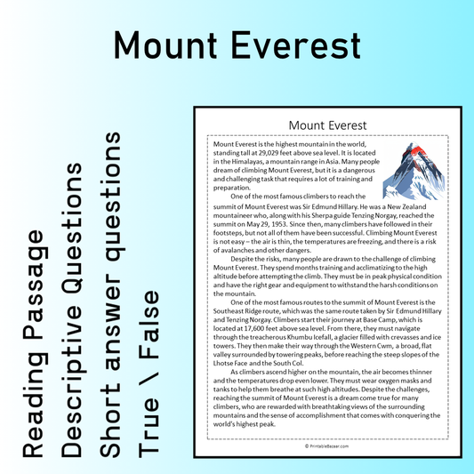 Mount Everest | Reading Comprehension Passage Printable Worksheet