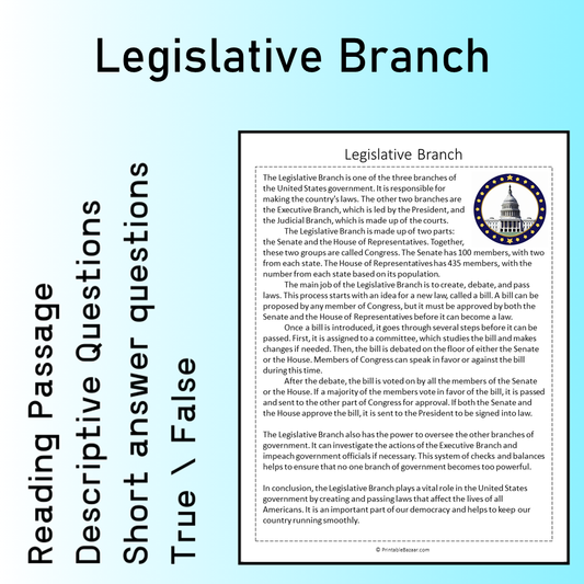 Legislative Branch | Reading Comprehension Passage Printable Worksheet