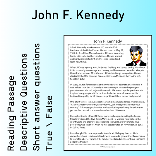 John F. Kennedy | Reading Comprehension Passage Printable Worksheet