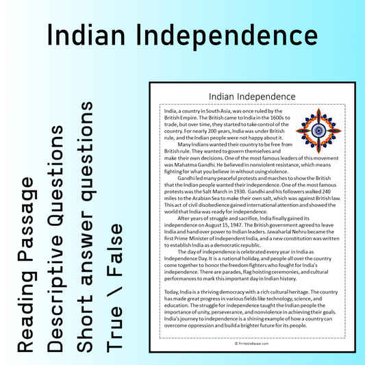 Indian Independence | Reading Comprehension Passage Printable Worksheet