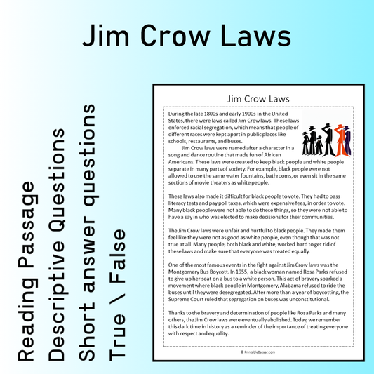 Jim Crow Laws | Reading Comprehension Passage Printable Worksheet