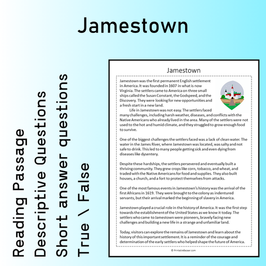 Jamestown | Reading Comprehension Passage Printable Worksheet