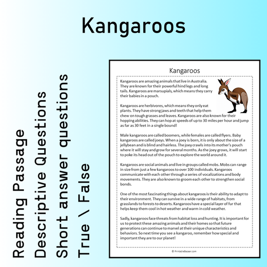 Kangaroos | Reading Comprehension Passage Printable Worksheet