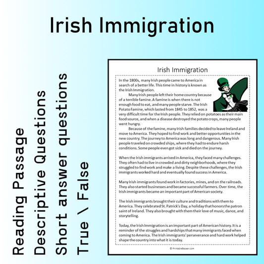 Irish Immigration | Reading Comprehension Passage Printable Worksheet
