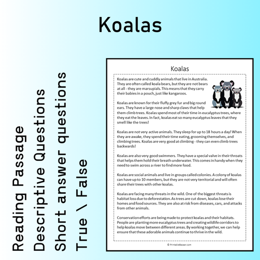 Koalas | Reading Comprehension Passage Printable Worksheet