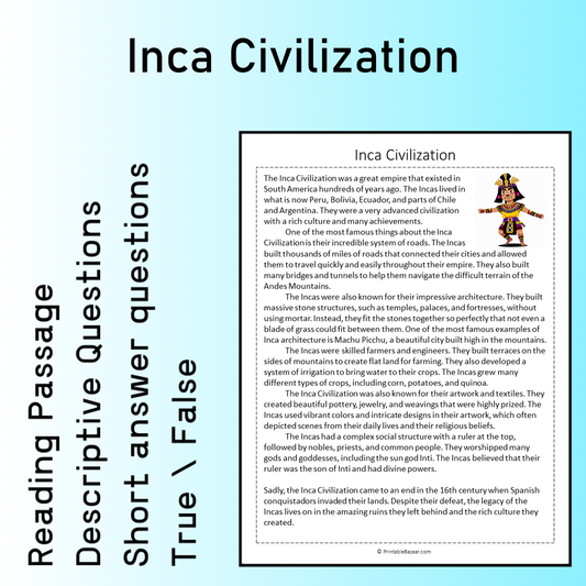 Inca Civilization | Reading Comprehension Passage Printable Worksheet