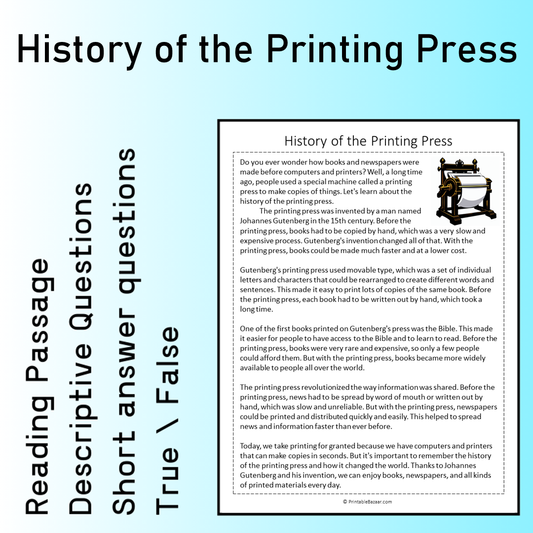 History of the Printing Press | Reading Comprehension Passage Printable Worksheet