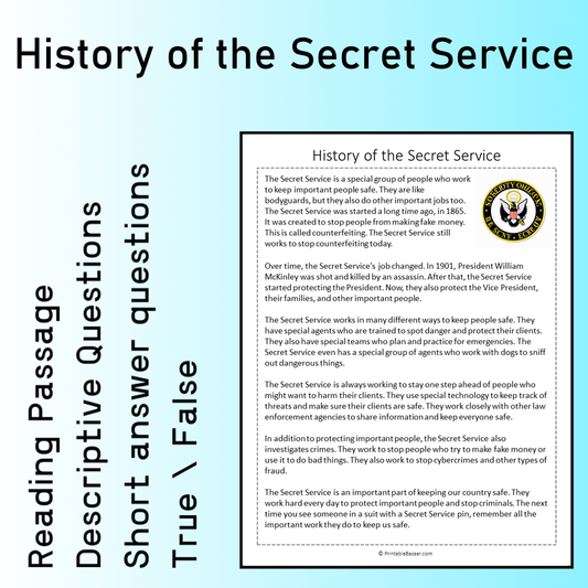 History of the Secret Service | Reading Comprehension Passage Printable Worksheet