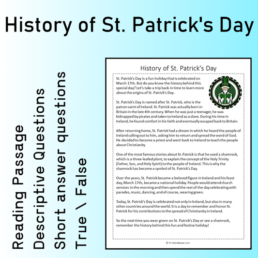 History of St. Patrick's Day | Reading Comprehension Passage Printable Worksheet