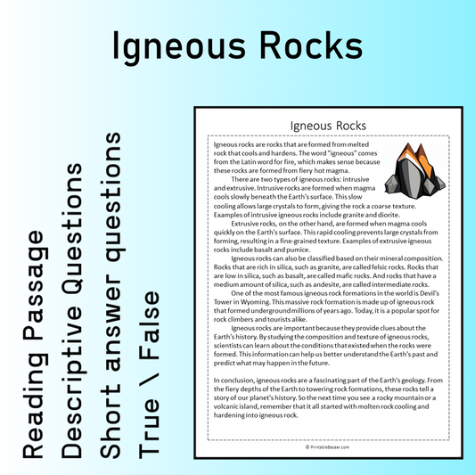 Igneous Rocks | Reading Comprehension Passage Printable Worksheet