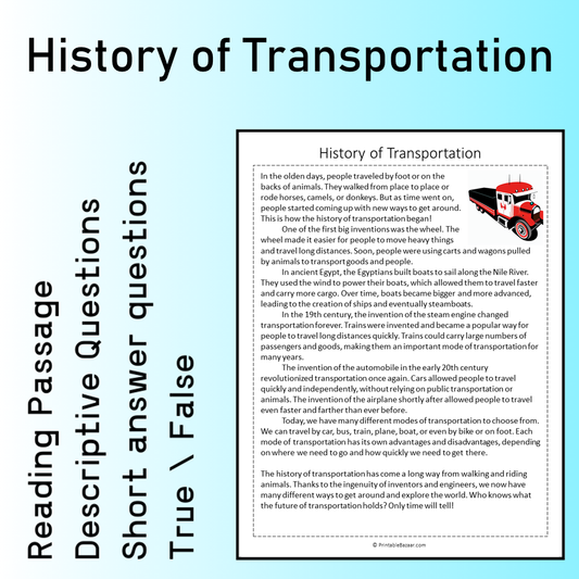 History of Transportation | Reading Comprehension Passage Printable Worksheet