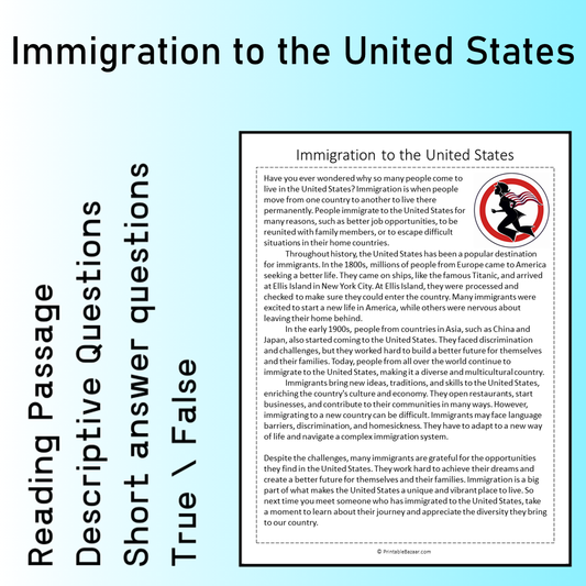 Immigration to the United States | Reading Comprehension Passage Printable Worksheet