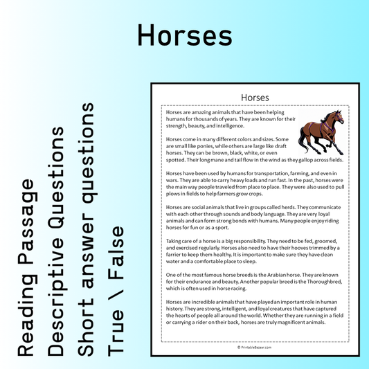 Horses | Reading Comprehension Passage Printable Worksheet
