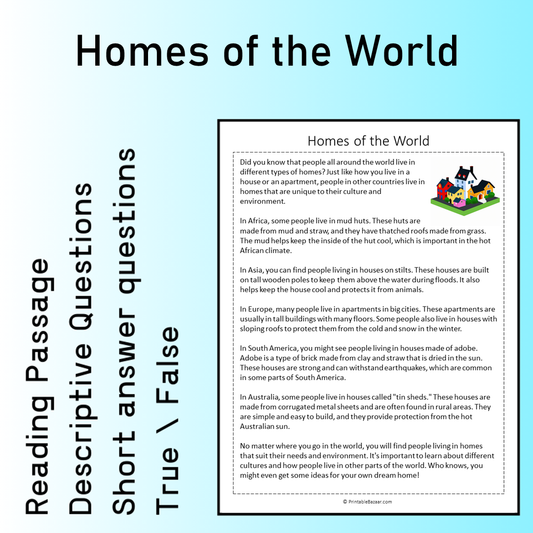 Homes of the World | Reading Comprehension Passage Printable Worksheet