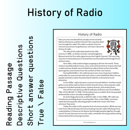 History of Radio | Reading Comprehension Passage Printable Worksheet