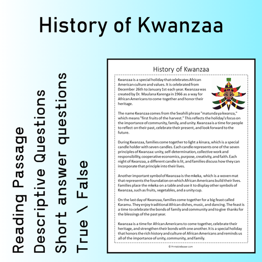 History of Kwanzaa | Reading Comprehension Passage Printable Worksheet