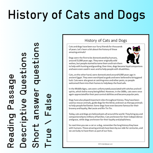 History of Cats and Dogs | Reading Comprehension Passage Printable Worksheet