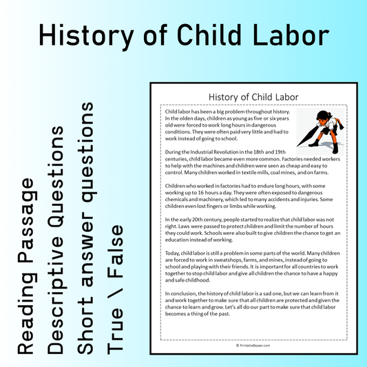 History of Child Labor | Reading Comprehension Passage Printable Worksheet