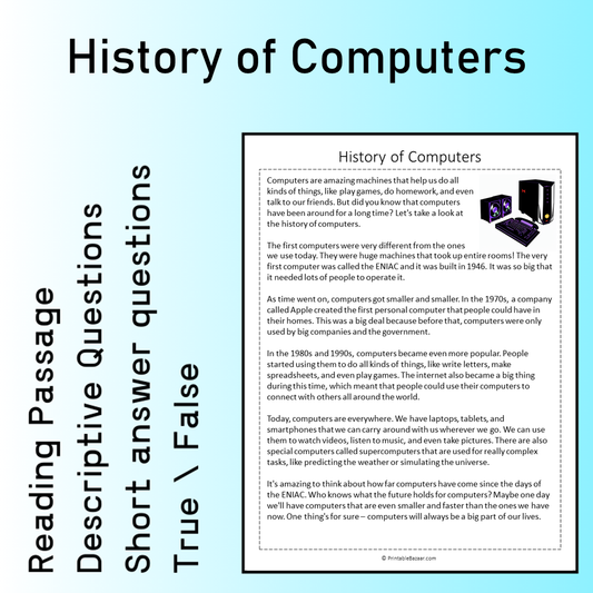 History of Computers | Reading Comprehension Passage Printable Worksheet