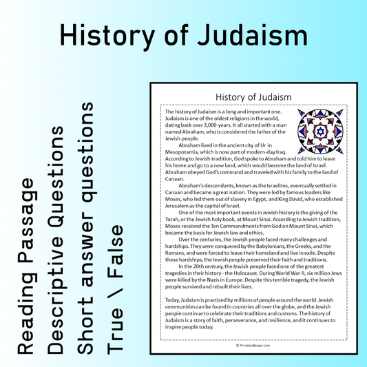 History of Judaism | Reading Comprehension Passage Printable Worksheet