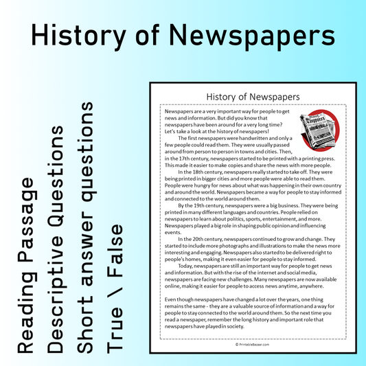 History of Newspapers | Reading Comprehension Passage Printable Worksheet