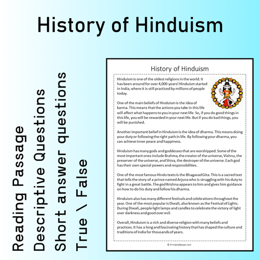 History of Hinduism | Reading Comprehension Passage Printable Worksheet