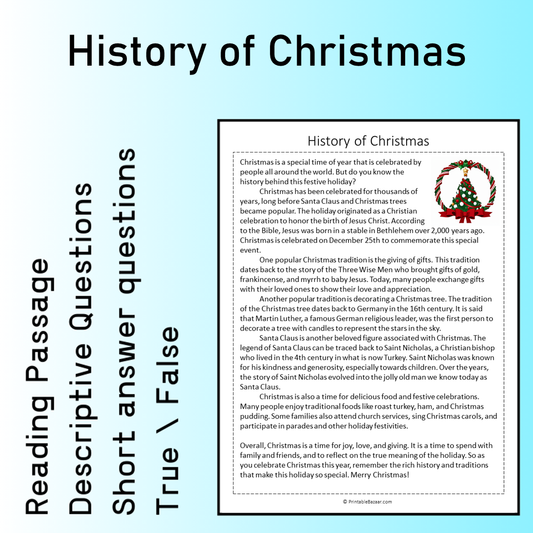 History of Christmas | Reading Comprehension Passage Printable Worksheet