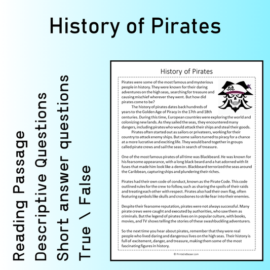 History of Pirates | Reading Comprehension Passage Printable Worksheet