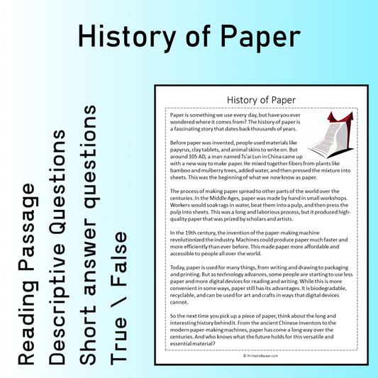 History of Paper | Reading Comprehension Passage Printable Worksheet