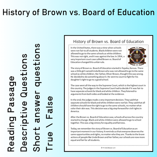 History of Brown vs. Board of Education | Reading Comprehension Passage Printable Worksheet