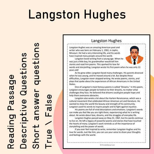 Langston Hughes | Reading Comprehension Passage Printable Activity