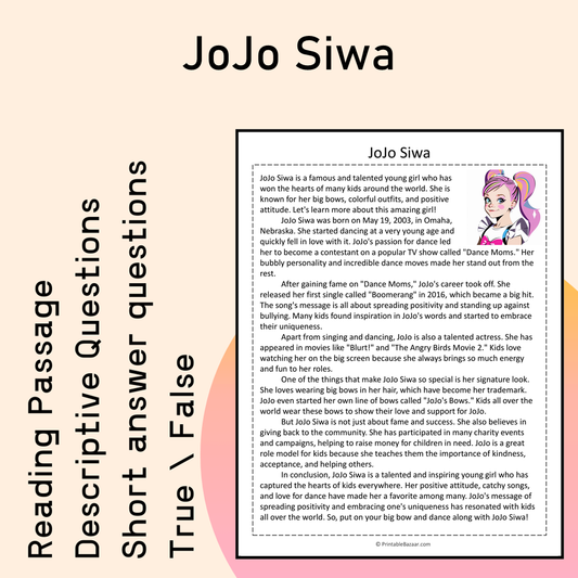 JoJo Siwa | Reading Comprehension Passage Printable Activity
