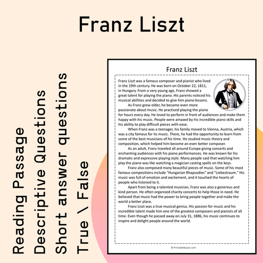 Franz Liszt | Reading Comprehension Passage Printable Activity
