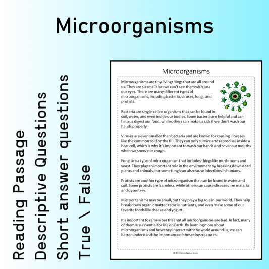 Microorganisms | Reading Comprehension Passage Printable Worksheet