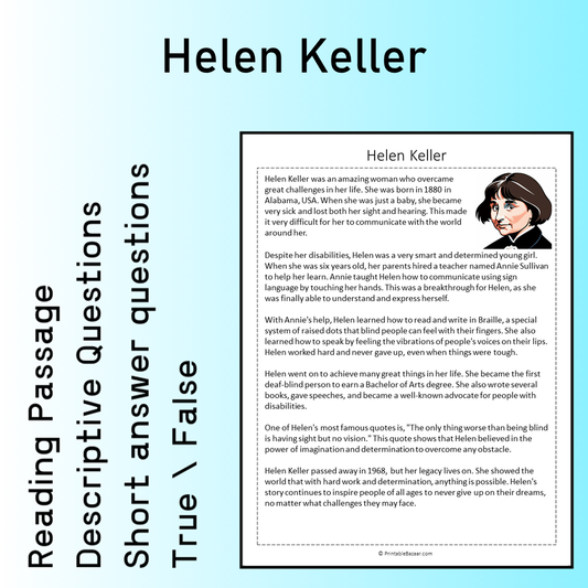 Helen Keller | Reading Comprehension Passage Printable Worksheet