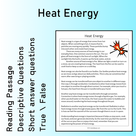 Heat Energy | Reading Comprehension Passage Printable Worksheet